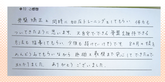 「骨盤矯正と同時に加圧トレーニングをしてもらい、体力もついてきたように思います。 又自宅でできる骨盤を維持できる方法も指導してもらい、今後も続けていけそうです。 8カ月の娘をめんどうみてもらいながら施術を最後まで安心してできたので助かりました。ありがとうございました。」